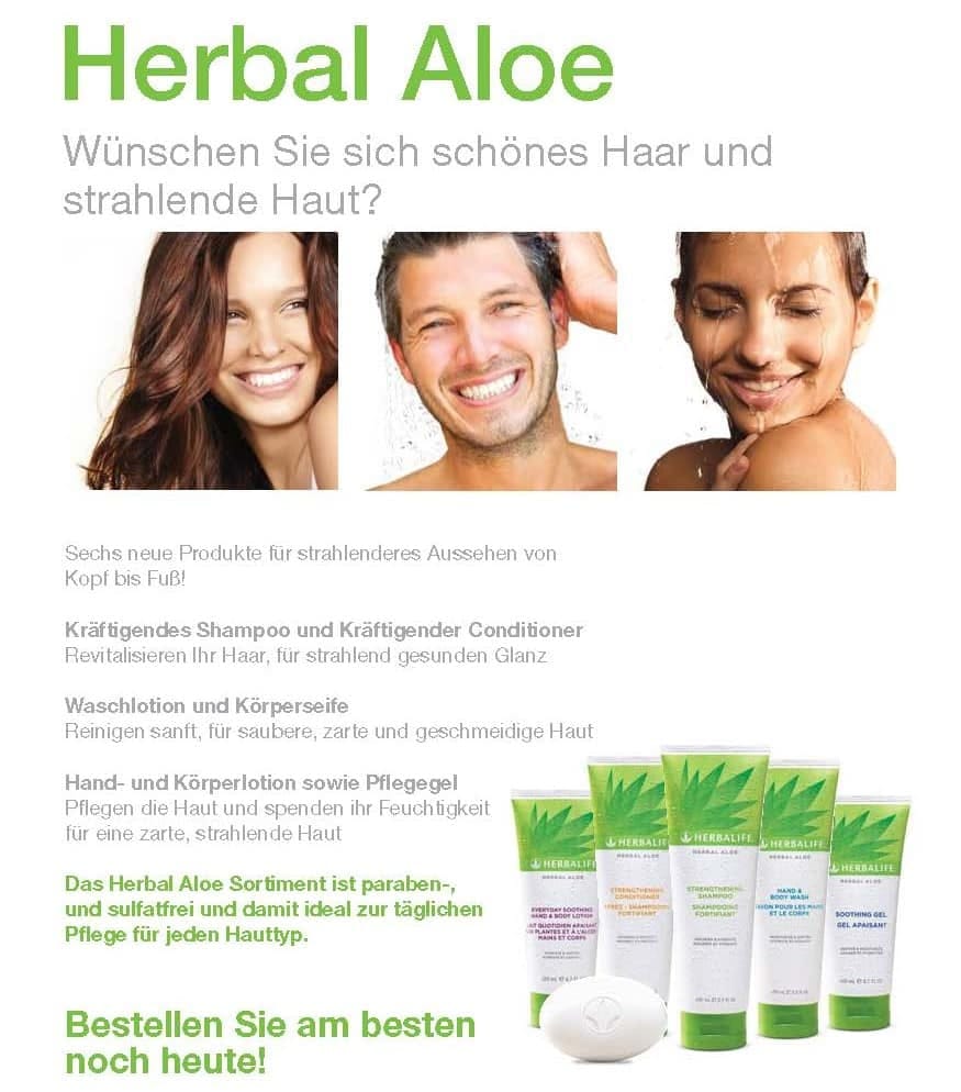 Erhalte kräftigere Haare dank des Shampoos und des Conditioners.* Erfrischende und sanfte Reinigung der Haut bieten die Körperseife oder die Herbal Aloe Waschlotion. Pflege deine Haut intensiv mit der Hand- & Körperlotion oder dem Aloe Pflegegel.