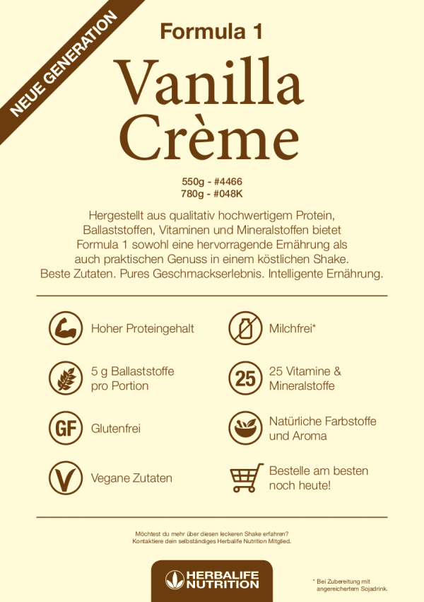 Der Herbalife Formula 1 Vanille Shake vereint hochwertige pflanzliche Proteine, Ballaststoffe sowie 25 essentielle Vitamine und Mineralstoffe in einem cremig-leckeren Shake mit feinem Vanillegeschmack. Perfekt für alle, die ihren aktiven Lebensstil unterstützen und sich ausgewogen ernähren möchten – ganz ohne Milchprodukte und künstliche Farbstoffe.