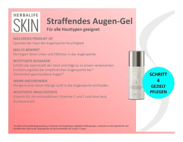 Das straffende Augen-Gel von Herbalife SKIN erhöht die Spannkraft der Haut und trägt so zu einem verbesserten Erscheinungsbild der empfindlichen Augenpartie bei.